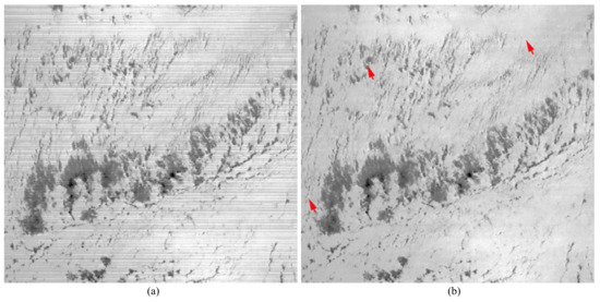The remote sensing image plays an important role in environment monitoring, resource monitoring and military and battlefield situation observations [1,2,3]. However, the output of sensing images often suffers from stripe-like noise, which seriously degrades the image’s visual quality and also yields a negative influence on high-level application, such as target detection and data classification [4,5,6,7]. Due to the inconsistent responses of detectors and the imperfect calibration of amplifiers, the gain and offset of true signals are various, producing stripe noise on Moderate Resolution Imaging spectrometer (MODIS) data and hyperspectral images. The MODIS data covers 36 spectral bands ranging in wavelength from 0.41 m to 14.4 m. Three typical striped images are displayed in Figure 1, and the stripe effect is obvious by zooming in. This noise is periodic for 10 pixels for the detectors’ calibration errors and the charge-coupled device array scanning forward and reverse across-track [8,9].