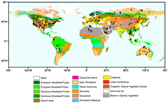 The NCDC Integrated Surface Data (ISD) is composed of hourly and synoptic (3-hourly) weather observations from over 35,000 stations worldwide, including more than 14,000 stations being actively updated (https://www.ngdc.noaa.gov/). Most stations are distributed over North America, Europe, Australia, and parts of Asia [39]. The AMSR VPD algorithm from this study was developed and validated based on ISD hourly station observations (ISH) of surface air temperature and dew-point temperature representing the AMSR satellite observation times. Three independent sets of weather station observations, each representing 67 global stations, were used for algorithm development and validation of the AMSR VPD retrievals over the two selected study years (2010 and 2013). For each of the 67 weather stations in each ISD validation set, stations were selected to represent the major global land cover classes defined by a MODIS (MCD12C1) global International Geosphere-Biosphere Programme (IGBP) land cover classification (Figure 1) [40]. Considering the uneven distributions of the ISD stations and different spatial scales represented by station and satellite measurements, the sites were selected to ensure that their numbers were proportional to the global areal coverage of the land cover classes. The stations were also selected to represent relatively homogeneous land cover areas within the overlying 25-km resolution EASE-grid cells, following previous AMSR LPDR validation studies [30,31]. For a given year, the stations were also required to have year-long (more than 360 days) and high-quality (quality flag indicating quality check passed) measurements within ±30 min of the satellite observation time. The weather station records used for training the VPD algorithm (Section 3.2) were independent of both validation datasets, with no overlapping stations. The two validation datasets were also relatively distinct from each other due to limited stations satisfying the above selection criteria and having observations covering both 2010 and 2013.