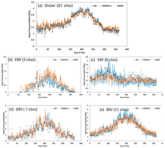 The AMSR VPD results show clear seasonal variations and daily fluctuations for all of the land cover classes that are similar to both MERRA-2 outputs and ISH measurements (Figure 4 and Figure 5). The p.m./a.m. standard deviations of the AMSR VPD time series are 0.48/0.14 kPa for the global, 0.40/0.11 kPa for ENF, 0.33/0.18 kPa for EBF, 1.04/0.35 kPa for GRS, and 1.40/0.50 kPa for BSV, respectively. For ISH VPD data, the corresponding standard deviations are 0.57/0.22 kPa for the global, 0.45/0.10 kPa for ENF, 0.50/0.10 kPa EBF, 0.96/0.26 kPa for GRS, and 1.64/0.83 kPa for BSV. Except for EBF, the peak VPD levels generally appeared over the summer season months of June, July, and August (JJA) in the Northern Hemisphere, where a majority of the validation sites are located. The EBF validation sites are distributed over Amazonia and Southeast Asia, both of which have substantial tropical rainforest but different climate patterns and seasonal dry-wet periods [56,57]. Here, the time series (Figure 4c) reflect collective VPD dynamics of the EBF sites, which exhibit small seasonal variation relative to higher latitude sites. In contrast to forests (Figure 4b,c), the amplitudes of VPD seasonal cycles for GRS and BSV are relatively large, due to the predominance of continental climate conditions with greater annual temperature variations for these sites. Compared with the p.m. results (Figure 4), the a.m. VPD time series of all three datasets (Figure 5) show much lower VPD levels and less pronounced seasonality. In particular, cooler early-morning temperatures promote low a.m. VPD levels for ENF throughout the year, with annual means of all three datasets that are less than 0.11 kPa for these sites. Accordingly, the ENF VPD morning retrievals tend to have degraded signal-to-noise ratios and more variable temporal patterns (Figure 5b).