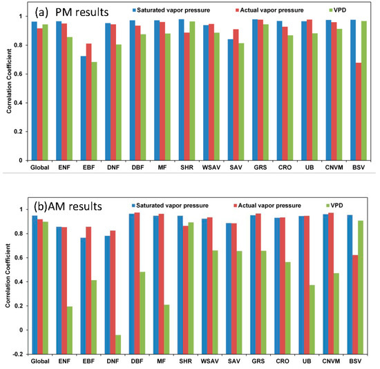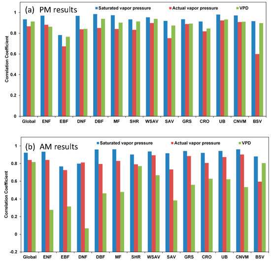Correlations between the Modern-Era Retrospective analysis for Research and Applications, Version 2 (MERRA-2) (a) p.m. and (b) a.m. predictions and Integrated Surface Global Hourly (ISH) station observations of saturation vapor pressure (), actual vapor pressure (), and Vapor Pressure Deficit (VPD) for 2010 over the global domain and major land cover classes including ENF—Evergreen Needleleaf forest; EBF—Evergreen Broadleaf forest; DNF—Deciduous Needleleaf forest; DBF—Deciduous Broadleaf forest; MF—Mixed Forest; SHR—Shrublands; WSAV—Woody savannas; SAV—Savannas; GRS—grassland; CRO—Croplands, UB—Urban and built-up; CNVM—Cropland/Natural vegetation mosaic; and BSV—Barren to sparsely vegetated.
