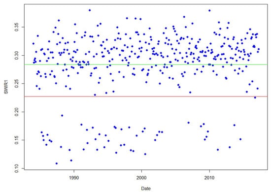 Graph of SWIR1 band across time. Blue dots represent observed SWIR1 values. The green line is the mean. The red line is −1 standard deviation. TDOM would identify any value below the red line as a dark outlier in the SWIR1 band. This same analysis is then performed in the NIR band to identify dark outliers.