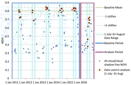 Since an analysis period may have more than a single observation, a method for summarizing these values is specified for both the basic and harmonic z-score methods to constrain the final z-score value. For this study, the mean of values was used. Change is then identified by thresholding the summary z-score value. For this project, summarized z-score values less than −0.8 were identified as change. This threshold was chosen based on analyst expertise obtained from iterative qualitative comparison of z-score results with post-disturbance image data.