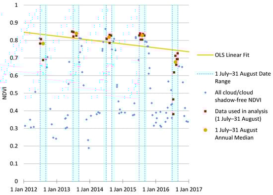 Illustration of the trend change detection algorithm. First observations are limited to the median of a specified date period (1 July–31 August in this example). Then, for a given epoch (2012–2016 in this example), an ordinary least squares linear regression model is fit to the annual median pixel value. The slope of this line is then thresholded to find change areas.