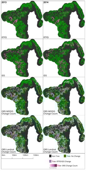 The heat map in Figure 7 shows different patterns of spatial agreement and disagreement than we observed in the Southern New England study area. The first notable difference is that both RTFD and ORS methods continue to capture areas that changed in both 2013 and 2014, while IDS maps only show new areas of change in 2014. This difference is inherent in the underlying methods, as IDS will often not remap previously existing long-term change. The second notable difference is that the area of new tree change in 2014 in the northeast portion of the study area was largely missed by RTFD, but was captured by both IDS and many ORS methods.