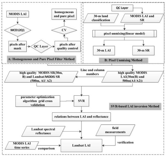 Moreover, the quality of the training samples, including sample distribution, can seriously affect the quality of all empirical approaches, including the SVR. In this study, the training samples spanned multiple years and included the whole crop-growing season. Therefore, the data quality was good and representative. The homogeneous and pure pixel filter method took the quality control file (QC layer) of the MODIS LAI products into consideration and ensured the quality of the MODIS LAI. This was the precondition for taking the MODIS LAI as training samples. The ratio of the standard deviation to the mean value (CV) in a statistical model can represent the difference of spectral reflectance of different objects in a mixed pixel. The MODIS pixels can be considered homogeneous and pure pixels when the thresholds of the QC and CV settle within a certain range. The pixel unmixing method decomposed the pixels of coarse-resolution satellite imagery into different endmembers and obtained the high-resolution LAI (or reflectance). It can obtain higher-quality training samples than other methods.