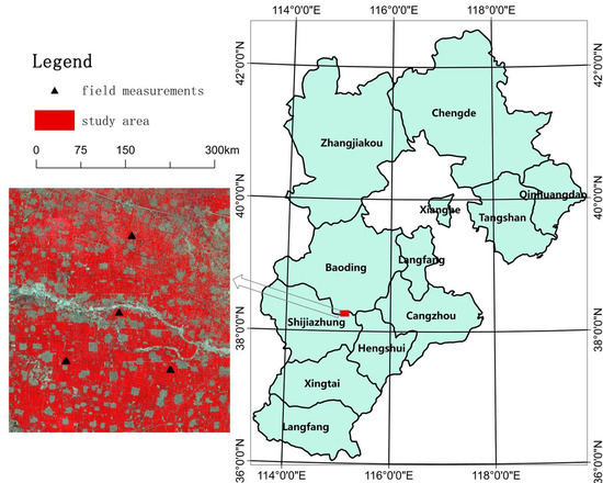 Field measurements in Baoding, Hebei Province, China were collected from 27 April to 3 May 2016 using LAI-2000, containing ten sampling points. Measurements from each site were collected at least twice. The corresponding Landsat data-acquisition times were 25 April and 4 May, and the inversion LAI were linearly interpolated to each sampling-point time.