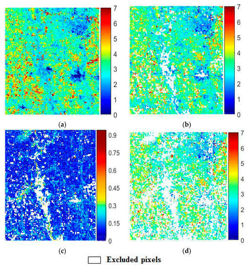 In this paper, a linear model was used to solve the mixed pixels, using the algorithm presented in Equation (3). A 3 × 3 sliding window was used to obtain the optimal solutions to the sets of equations. The MODIS surface reflectance and LAI products were unmixed by this method, described in Section 2. For example, in the SMEX02 study area, 5300 MODIS pixels were used to obtain the unmixing pixels and 2902 MODIS pixels were removed after QC checking. Finally, fewer than 400 arable land pixels were chosen in one tile (the day 137 of 2003).