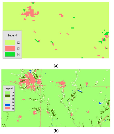 Taking the SMEX02 site area as an example, the area was mainly composed of natural vegetation and crops. Corn and soybean accounted for >80% of the total area. Figure 4 shows the MODIS classification map (Figure 4a) and the 30-m resolution GlobeLand30 surface covering products (Figure 4b,c). The study area included three categories from the MCD12Q1_IGBP classification system: number 12: agricultural land; number 13: urban and construction area; and number 14: junction of agricultural land and natural vegetation. The following classification of the GlobeLand30 product is used: arable land (10), forest (20), grassland (30) (accounting for 5% of the total area), wetland (50) (accounting for ~1% of the total area), water body (60), artificial surfaces (80), and bare land (90).