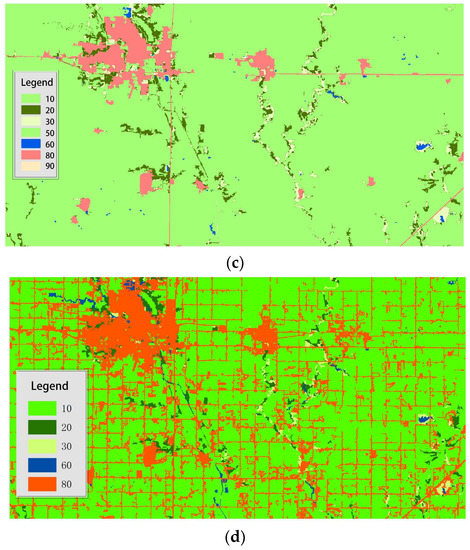 Classification products of the Soil Moisture Experiment 2002 (SMEX02) near Des Moines, Iowa, United States: (a) MCD12Q1_IGBP; (b) GlobeLand30 in 2000; (c) GlobeLand30 in 2010; (d) 30-m classification product. Notes: (a) 12: agricultural land; 13: urban and construction area; 14: junction of agricultural land and natural vegetation. (b–d) 10: arable land; 20: forest; 30: grassland; 50: wetland; 60: water body; 80: artificial surfaces; 90: bare land.