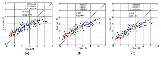 Figure 5 shows that the retrieved LAI agrees well with the field measurements. At the field scale, the R2 (coefficient of determination) between retrieved Landsat LAI and field measurements is 0.79 for the homogeneous and pure pixel filter method with upscaled Landsat reflectance as the training samples (dataset A1) (Figure 5a). The R2 value is 0.81 for the homogeneous and pure pixel filter method with MODIS reflectance as the training samples (dataset A2) (Figure 5b), slightly better than dataset A1. The correlation coefficients of dataset A2 and dataset B was similar (Figure 5b,c), where the retrievals of unmixed MODIS reflectance and LAI using the pixel unmixing method (method B) shown in Figure 5c was slightly higher, with the R2 value of 0.82 and a root mean square error (RMSE) value of 0.65. Although we had obtained high-quality pixels through two methods, it was inevitable that the MODIS LAI was small and underestimated due to mixing pixels at the small LAI stage. When the Landsat reflectance at 30-m resolution (the cover area of vegetation categories of the pixel usually is larger than that of MODIS at the small LAI stage) was used as the input for the SVR models, the results were overestimated when LAI was 0–2. We found that the results of approach B were improved when LAI was <2. However, when the LAI was greater than 3, the inversion results were significantly underestimated, especially on 8 July (Figure 6) [21]. One reason for this could be that, generally, the relationship between LAI and reflectance gradually becomes saturated. Another reason for the underestimation may have been that when the LAI was >3, especially when the LAI was much greater, the MODIS inversion algorithm was mainly using the backup algorithm on SMEX02, and the training samples obtained using the LUT method contained fewer pixels of LAI > 3. The result was that the training sample representativeness with LAI greater than 3 was poor. It is also clear that the mixed-pixel decomposition method had higher accuracy on 1 and 8 July due to the removal of other vegetation types (mainly forest and grassland, which grew better from June–July), and LAI also showed an increasing trend.
