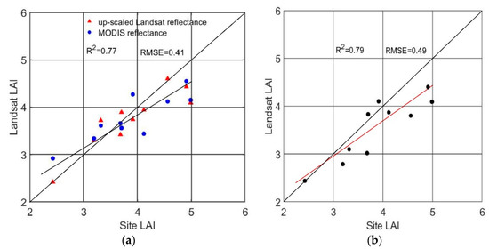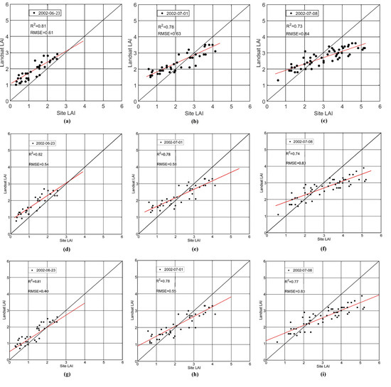 Furthermore, when the upscaled Landsat reflectance and MODIS LAI were used to build the relational model, geometrical registration between Landsat and MODIS was not performed in this study. This led to a bias when calculating the CV of the Landsat surface reflectance in a MODIS pixel. The CV threshold of the homogeneous MODIS pixel was determined based on LAI sample quality and quantity from subjective experience at present. The threshold may vary with different study sites or landscapes. In order to compare the inversion results from these two sites in the paper, the same threshold of 0.15 was used. Additional study and analysis are needed to quantify the threshold. In this paper, we used the eight-day MODIS LAI products. This means that the MODIS LAI product for the period was made up from eight independent days. However, the Landsat imagery reflected the instantaneous optical characteristics of vegetation for the Landsat acquisition date. Therefore, differences between the Landsat and MODIS data products were observed in time and space.