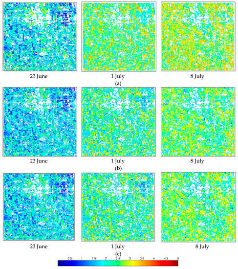 The LAI inversion in time series at the SMEX02 site (23 June, 1 July, and 8 July): (a) the results of dataset A1; (b) the results of dataset A2; (c) the results of dataset B.