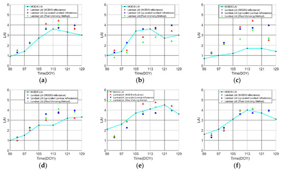 LAI inversion in time series at the Baoding area (MODIS DOY: 89–129), based on the homogeneous and pure pixel filter method and the pixel unmixing method. (a) pixel one; (b) pixel two; (c) pixel three; (d) pixel four; (e) pixel five and (f) pixel six.