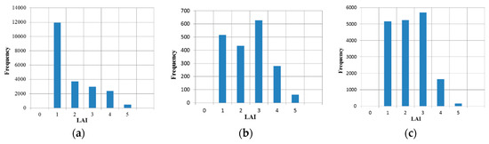 Histogram of LAI from the LAI-SR samples of SMEX02. (a) dataset A1 (upscaled Landsat reflectance at the 500-m resolution and MODIS LAI products); (b) dataset A2 (MODIS reflectance and LAI products); (c) dataset B (unmixed MODIS surface reflectance and LAI products at 30-m resolution).