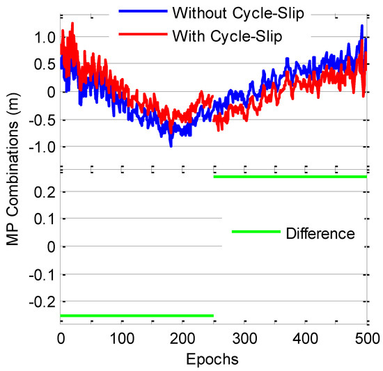 MP combination time series of B1 signal with and without cycle slips at 500 consecutive epochs for BDS-2 MEO satellite C12 at station SGG1 on 13 July 2016.