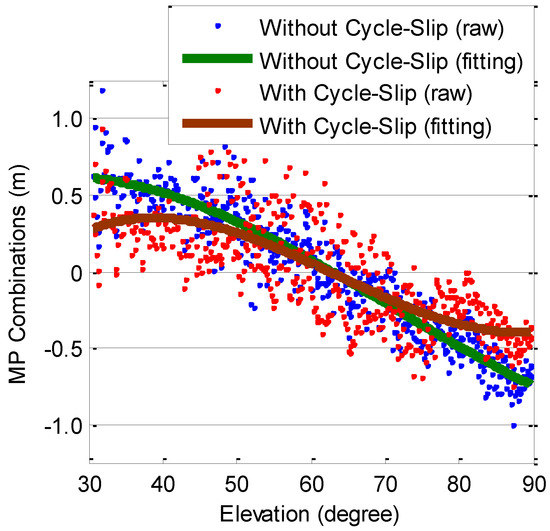 Figure 2 illustrates the MP combination time series of B1 signal with and without cycle slips at 500 consecutive epochs for BDS-2 MEO satellite C12 at station SGG1 on 13 July 2016. We artificially add a cycle slip at the 250th epoch so that its effects on SICB modeling can be analyzed. For the three continuous ambiguity arcs, the respective float phase ambiguities are calculated. It is clearly seen that there are constant differences between the absolute MP values with and without cycle slips. The MP differences reach −0.251 and 0.251 m before and after the cycle slip occurs, respectively. For further analysis, Figure 3 shows the MP combination time series as a function of elevations. The third-order polynomial fitting is conducted for the MP series, and these results are also provided in Figure 3. The MP fitting values with and without cycle slips show significant differences at elevation angles lower than 50° and higher than 70°, which will negatively affect the elevation-dependent modeling of SICB.