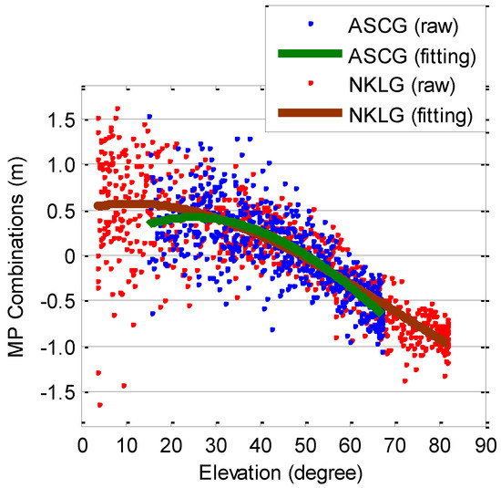 Figure 4 presents the MP combination time series of B1 signal at 800 consecutive epochs for BDS-2 MEO satellite C14 at stations ASCG (7.92°S, 14.33°W) and NKLG (0.35°N, 9.67°E) on 19 August 2016. The tracking time of C14 is different at the two stations located in different longitude and latitude regions. Figure 5 shows the dependence of the MP combination time series on the elevation angles. The third-order polynomial fitting is also carried out for these MP series. The MP fitting values at stations ASCG and NKLG show differences at both ends of elevations, but the MP differences with a level of several centimeters are much smaller than those caused by the cycle slips shown in Figure 3. The different tracking of a satellite at different stations also has navigate effects on the SICB modeling.