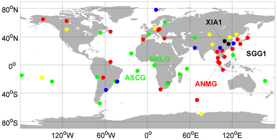 Geographical distribution of 60 stations. Both the red and green points refer to the MGEX stations, and can offer B1/B2 and B1/B2/B3 BDS-2 tracking, respectively. Both the yellow and blue points refer to the iGMAS stations, and the former are able to offer both B1/B2/B3 BDS-2 and B1/B3 BDS-3S tracking, while the latter can only offer B1/B2/B3 BDS-2 tracking. The black points refer to the stations with the capability of tracking the new navigation signals. The stations indicated by the station name will be used as illustrations in the manuscript.