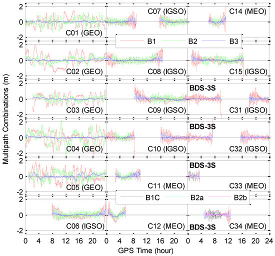 Figure 7 shows the time series of MP combinations of each BDS-2 and BDS-3S satellite at station SGG1 on 13 July 2016. We use the carrier phase observations on the B3 frequency to form the MP combinations for the code observations on the B1 and B1C frequencies, while the carrier phase observations on the B1 frequencies are used to form the B2, B3, B2a and B2b MP combinations. The MP combination time series of the B1C signal for C32 are not presented because of frequent gross errors. For the BDS-2 GEO satellites, the MP series contain apparent bias variations, which can reach up to 2 m on B1 and B2 frequencies, due to the severe ground multipath effects. Bias variations can also be observed in MP series from BDS-2 MEO and IGSO satellites, but with less fluctuation and smaller amplitude. With regard to BDS-3S satellites, no significant bias variations can be noticed, except for the C31. The MP series of C31 on the B1 frequency show systematic long-term variations, especially for the period 18:15~24:00 (Figure 7).