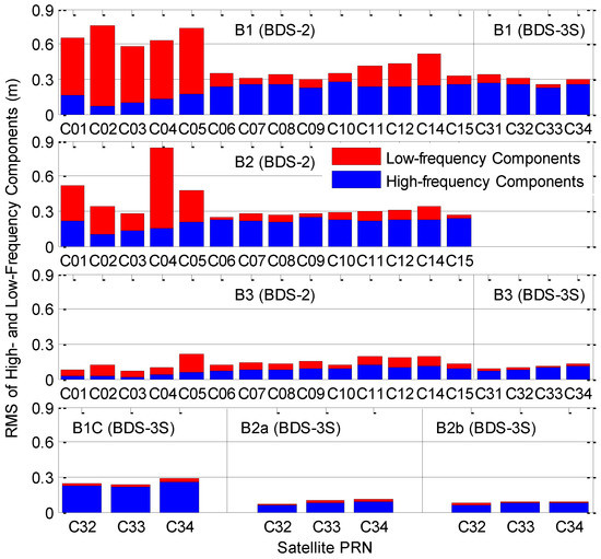 For further analysis, the root mean square (RMS) statistics of the high- and low-frequency components in the time series of MP combinations for each BDS-2 and BDS-3S satellite on each frequency are provided in Figure 8. We can separate the high- and low-frequency components in MP series using wavelet decomposition and reconstruction. We employ the Symlet wavelet “sym5”. The datasets from SGG1 on 7–13 July 2016 are adopted. The long-term changes, namely SICB variations, are mainly reflected by the low-frequency components, while the code multipath and noise (CMN) errors are mainly contained in the high-frequency components. The magnitude of phase multipath and noise (PMN) errors is very small, and thus they can be ignored. Actually, partial multipath effects will be also included in the low-frequency components, especially for the BDS-2 GEO satellites. Due to the presence of SICB, the RMSs of the low-frequency components are relatively larger for BDS-2 satellites, especially for the BDS-2 GEO satellites, the RMSs of which are enlarged by the severe ground multipath effects. For the new navigation signals and the legacy signal B3 of BDS-3S satellites, the RMSs of the low-frequency components are all smaller than 2.5 cm. Regarding the low-frequency components on B1 frequency for BDS-3S satellites, the corresponding RMS values are 7.2, 5.4, 3.1 and 4.1 cm for C31, C32, C33 and C34, respectively. We can conclude that the SICB variations should be very small for the BDS-3S satellites.
