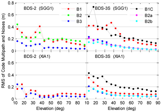 The CMN can be used as an important index to characterize the quality of code observations. Figure 9 shows the dependence of RMSs of the high-frequency components in the time series of MP combinations on the satellite elevations at station SGG1. The RMSs are calculated for each increment of 5° in satellite elevations. It is clearly seen that B3, B2a and B2b exhibit the smallest CMN (Figure 9), which are signals with a high chipping rate of 10.23 Mcps. The chipping rates of all BDS signals are provided in Pan et al. [22]. The B2a, B2b and B3 signals of BDS-3S satellites show a comparable performance for CMN, and the RMS CMN is 15–23 cm at low elevation angles and 2–3 cm at zenith. As to the B1C signal of BDS-3S satellites, pseudorange errors of 13 cm are obtained close to zenith (90°), whereas increased values of about 0.6 m are encountered at low elevations. The RMS CMN of B1C signal is systematically larger than that of B1 signal by several centimeters because of the lower code chipping rate of B1C, which is equal to half that of B1 signal. The unexpected RMS statistics of CMN for B1 signal at satellite elevation angles from 30° to 50° can be attributed to the scarce observations. Compared with the BDS-3S satellites, the BDS-2 CMN on B1 and B3 frequencies show superior performance at mid and low elevations, and exceeds the BDS-3S CMN by several millimeters to 2 cm at elevation angles higher than 60°. The CMN for the BDS-2 B2 signal is of the same order of magnitude as that for the BDS-2 B1 signal. Differing surroundings near the station and the differing tracking performance of specific receivers and antennae in terms of multipath sensitivity will cause CMN differences, which can be revealed by direct comparison with the results from XIA1 of 2–15 September 2016 shown in the bottom sub-panels of Figure 9. The CMN results for B2a frequency at station XIA1 have to be excluded because of frequent gross errors.