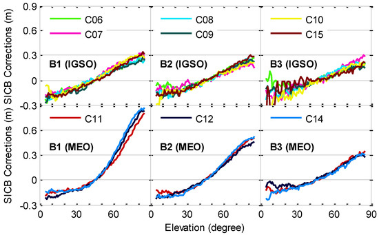 The estimated correction model parameters for BDS-2 satellites are shown in Figure 10. The code observations in the B1 band from BDS-2 MEO satellites are seriously impacted by SICB, and the SICB corrections reach approximately 0.9 m close to zenith. The SICB variations have much less effect on the BDS-2 IGSO satellites than the BDS-2 MEO satellites. The code observations on the B2 frequency are less affected by the SICB than those on the B1 frequency. The B3 signal has the smallest SICB corrections. The SICB corrections on the same frequency are very consistent for satellites with the same orbit type, and the differences among them are usually at a level of several centimeters. To pursue high accuracy, we still establish the SICB correction model for each satellite rather than IGSO-type or MEO-type satellites [10,11].