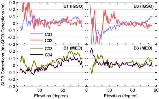 Figure 11 provides the estimated correction model parameters for BDS-3S satellites. In conjunction with the results shown in Figure 10, we can conclude that the SICB corrections for BDS-3S satellites are much smaller than those for BDS-2 satellites, and are usually confined to 0.1 m. It is interesting to notice that the SICB corrections on B3 frequency at elevations larger than 20° for C31 and at elevations larger than 40° for C32 are strongly elevation dependent, while the corresponding SICB corrections at other elevations are unstable due to the effects of the larger receiver CMN. We can deduce that the SICB corrections for the two legacy signals of all BDS-3S IGSO satellites depend on the elevations, although the elevation-dependent characteristics of SICB corrections with a small range of variance are severely contaminated by the receiver CMN for some cases. As to the BDS-3S MEO satellites, the estimated SICB corrections on the B1 frequency also seem to be elevation dependent. However, the SICB values of these satellites are different at the same elevation angles with different azimuth angles [20]. Thus, the established elevation-dependent SICB correction model for the B1 and B3 signals of BDS-3S MEO satellites is not applicable, as will be demonstrated in the following. The abnormal fluctuation of SICB corrections for the BDS-3S satellites at low elevations can be attributed to the larger CMN.
