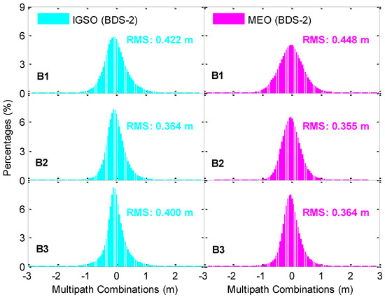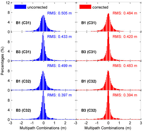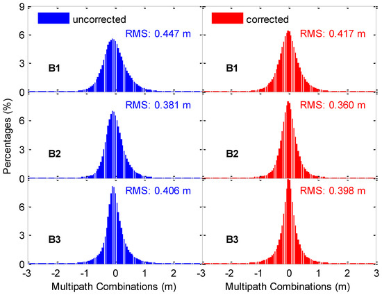 To validate the effectiveness of our SICB correction model, the SICB corrections are added to the original code observations to reform the MP combinations. Figure 12 illustrates the distribution of MP combination time series with application of SICB corrections for BDS-2 IGSO satellites. Datasets from 58 stations spanning 32 days are used. For the purpose of comparison, the distribution of original MP combination time series is also presented in this figure. It is clearly seen that both the uncorrected and corrected MP combinations are approximately normally distributed, but the expectations of the former ones show a slight deviation from zero. Compared with the original MP series, the MP series with SICB corrections account for larger percent of smaller errors. In each panel, the RMSs of MP series are also provided. The RMS values of corrected MP series are reduced by 7%, 6% and 2% over the uncorrected MP series on the B1, B2 and B3 frequencies, respectively. The corresponding results for BDS-2 MEO satellites are shown in Figure 13. The benefits from the SICB correction for IGSO satellites are smaller than those for MEO satellites. The decrease in RMS values for the corrected MP series over the uncorrected MP series is 18%, 14% and 5% on the three frequencies, respectively. Figure 12 involves 11.5, 11.5 and 5.4 million epoch-wise MP values for B1, B2 and B3 frequencies, respectively, while the corresponding numbers are 3.7, 3.7 and 2.1 million for the three frequencies in Figure 13, respectively. These numbers are just used to clarify the condition of the inputs for the SICB modeling. The number of epoch-wise MP values of BDS-2 MEO satellites is significantly smaller than that of BDS-2 IGSO satellites due to the relatively shorter tracking time. Theoretically, the accuracy of the model parameters will be improved when more datasets are involved in the SICB modeling. However, no more improvements can be achieved after the amount of data reaches a critical point, even if more datasets are subsequently included [23]. According to Li et al. [23], the number of epoch-wise MP values is sufficient for the SICB modeling in this study.