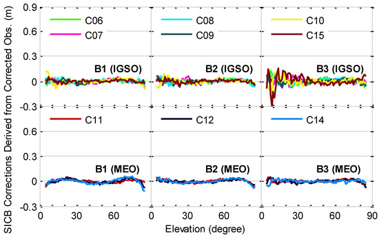 To further analyze the improved measurements, we reconstruct the elevation-dependent SICB correction model for the BDS-2 IGSO and MEO satellites using the code observations corrected by the previously established SICB correction model. The results are shown in Figure 14. It is clearly seen that the elevation-dependent model values after applying the SICB corrections are close to zero, indicating the successful correction of SICB for the code observations. The improved code measurements can be safely used for precise applications.