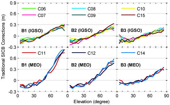 The estimated model parameters of the traditional SICB correction model for BDS-2 IGSO and MEO satellites are provided in Figure 15. Compared with the modeling results shown in Figure 10, the traditional and improved SICB correction models have similar trends against elevations. However, the traditional SICB corrections miss a lot of detail about elevation-dependent variations, and fluctuate much more than the improved SICB corrections. In addition, the absolute level of SICB corrections also shows differences for the traditional and improved models. For example, the improved SICB corrections on the B3 frequency close to the zenith are approximately 0.3 m for C07, while the corresponding traditional SICB corrections are approximately 0.22 m.