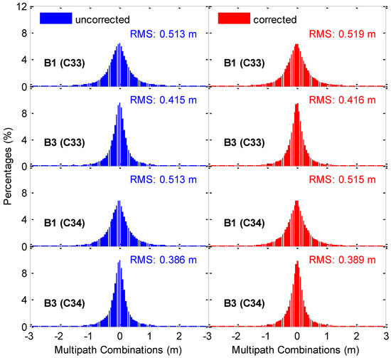 Figure 18 shows the distribution of uncorrected and corrected MP combination time series of B1 and B3 frequencies for BDS-3S MEO satellites C33 and C34. Both uncorrected and corrected MP combinations are approximately normally distributed. Moreover, the distribution is nearly identical for the two different groups of MP combinations. In each panel, the RMSs of MP series are also presented. Unlike the results shown in Figure 12, Figure 13 and Figure 17, the RMS values of MP time series of BDS-3S MEO satellites are slightly increased by 1–6 mm after applying the SICB corrections. This is because the SICB variations on B1 and B3 frequencies are related not only to the elevation angles, but also to the azimuth angles of BDS-3S MEO satellites [20]. Therefore, the elevation-dependent SICB correction model cannot be applied to these satellites. A further investigation of SICB modeling as a function of elevations and azimuths for these satellites is needed. In Figure 18, there are approximately 0.18 and 0.16 million epoch-wise MP values for C33 and C34, respectively.