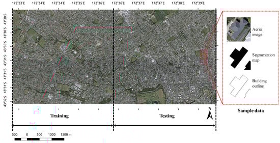 To evaluate the performance of different methods, a study area that covers 32 km in Christchurch, New Zealand is chosen for this study. The aerial image dataset and corresponding building outlines (polygons in .shp format) are downloaded from Land Information of New Zealand (https://data.linz.govt.nz/layer/53413-nz-building-outlines-pilot/). The spatial resolution of the aerial images is 0.075 m. The original images are captured during the flying seasons of 2015 and 2016. Later, they are converted into orthophotos and divided into tiles by the provider. The size of each tile is 3200 × 4800 pixels (240 × 360 m). Prior to conducting our experiments, we merge the 370 tiles within the study area into a single mosaic. Additionally, for the purpose of accurate roof segmentation, we manually adjust vectorized building outlines to ensure that all building polygons are strictly aligned with their corresponding roofs.