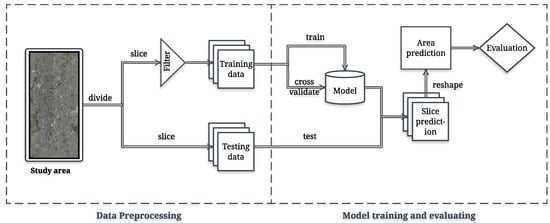 The aerial imagery from the study area is divided into training and testing regions. Later, the aerial imagery from both regions is processed by a sliding window of 224 × 224 pixels (with stride of 224 pixels) to generate image slices. In deep learning, particularly for classification tasks, biased data typically leads to overfitting and poor generalization []. To avoid this issue, thresholding is applied to the slices generated from the training region to filter out image slices with low building coverage rates (e.g., building coverage rate ≤ 15%). After data preprocessing, the number of samples in training, validation and testing data are 27,912, 1952 and 71,688, respectively.