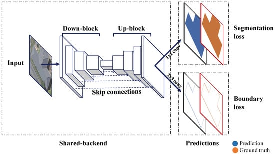 The network architecture of the proposed BR-Net model. The BR-Net model adopts a modified U-Net structure as a shared backend and performs multitask predictions for roof segmentation and outline extraction.