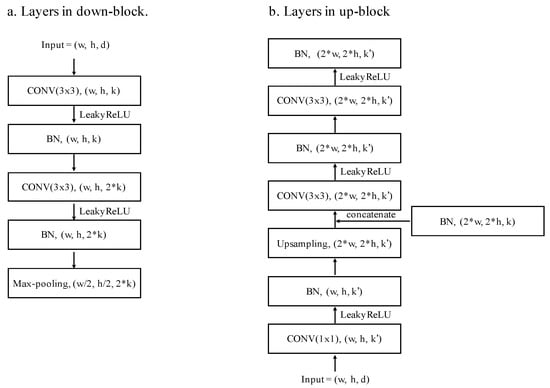 Figure 4a presents the structure of a down-block. The h, w, and d represent the height, width, and depth of an input, respectively. k represents the number of kernels that are utilized for convolution operations. Each down-block has two convolutional layers followed by two LeakyReLU activation functions, two BN layers, and a max-pooling layer. For each input, a down-block generates an output with half the width and height. The numbers of kernels in the four down-blocks are [24, 48, 96, 192].