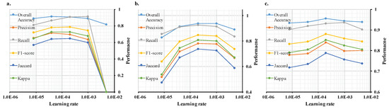 Model performances using learning rates of 5 × 10, 1 × 10, 2 × 10, 4 × 10 and 8 × 10: (a) performances of FCN8s under various learning rates; (b) performances of U-Net under various learning rates; and (c) performances of BR-Net under various learning rates.