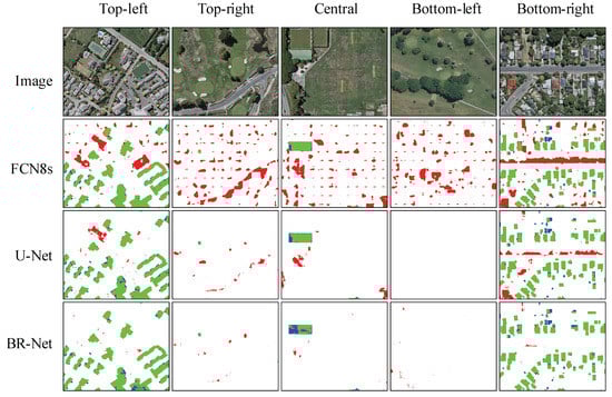 Results of roof segmentation of regions by FCN8s, U-Net, and the proposed BR-Net. The five regions are located in the top-left, top-right, central, bottom-left, and bottom-right portions of the testing area. Each region contains 2240 × 2240 pixels. The green, red, blue, and white channels in the results represent true positive, false positive, false negative, and true negative predictions, respectively.