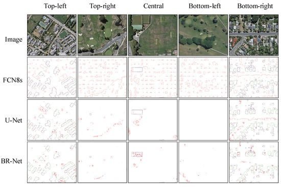 Figure 7 presents the outline extraction results of the FCN8s, U-Net, and BR-Net methods. In residential regions (e.g., top-left and bottom-right regions), the majority of building outlines are extracted by all three models. However, the results from the FCN8s model contain more false positive polygons and lines compared to the other two methods. Compared to U-Net, BR-Net presents fewer false positives in adjacent areas between buildings and roads. Similar to the residential regions, in the non-residential regions in the top-right, central, and bottom-left portions of the test area, the FCN8s method generates a relatively large number of false positives.