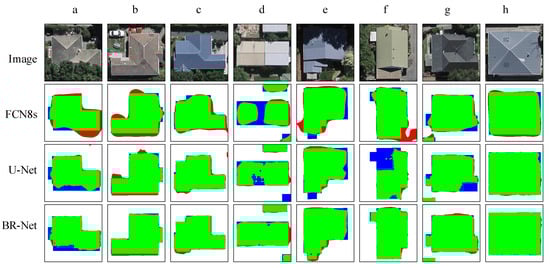 Representative results of single-building-level outline extraction by FCN8s, U-Net and, BR-Net. The green, red, blue, and white channels in the results represent true positive, false positive, false negative, and true negative predictions, respectively.