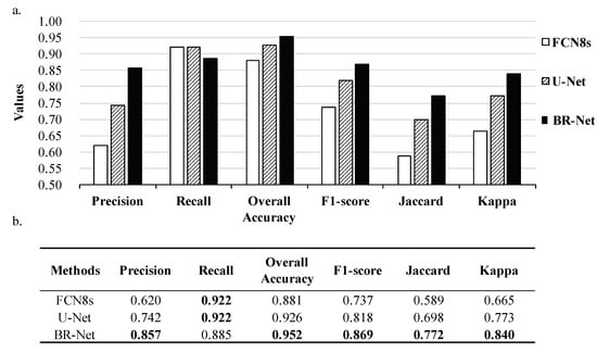 Comparison of segmentation performances of FCN8s, U-Net, and BR-Net across the entire testing area. (a) Bar chart for performance comparison. The x- and y-axis represent the evaluation metrics and corresponding values, respectively. (b) Table of performance comparisons of methods. For each evaluation metric, the highest values are highlighted in bold.