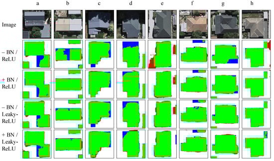 Figure 11 presents representative roof segmentation results from BR-Net with different combinations of components. Compared to the basic BR-Net model (−BN/ReLU), adding BN (+BN/ReLU) or replacing the ReLU activation function with a LeakyReLU activation function (−BN/LeakyReLU), or combining both batch normalization and LeakyReLU (+BN/LeakyReLU) slightly reduces the number false positives (e and h) and false negatives (a, b, d, and g), which leads to better overall performance for roof segmentation. The performance improvements resulting from adding BN and replacing the activation function are quite similar.