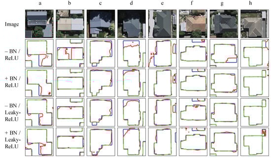 Figure 12 presents representative results of single-house-level outline extraction from BR-Net with different combinations of components. Similar to the roof segmentation results, the BR-Net model with the addition of BN (+BN/ReLU) or replacement of the ReLU activation function with a LeakyReLU activation function (−BN/LeakyReLU), or combining both BN and LeakyReLU (+BN/LeakyReLU), produces better building contours for both shadowed (a, c, d, and g) and non-shadowed (b, e, f, and h) images. However, the differences between the BR-Net models of +BN/ReLU, −BN/LeakyReLU, and +BN/LeakyReLU are not significant.