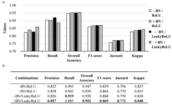 In Figure 13b, the BR-Net model with BN and LeakyReLU (+BN/LeakyReLU) produces the highest values for five out of six evaluation metrics, namely precision, overall accuracy, F1 score, Jaccard index, and kappa coefficient. Compared to the basic model, the increases in these metrics are 4.3% (0.857 vs. 0.822), 0.5% (0.952 vs. 0.947), 1.2% (0.869 vs. 0.859), 2.1% (0.772 vs. 0.756), and 1.6% (0.840 vs. 0.827), respectively. However, the model with BN and LeakyReLU results in the lowest value of recall with a decrease of approximately 2.0% (0.885 vs. 0.903) compared to the base model.