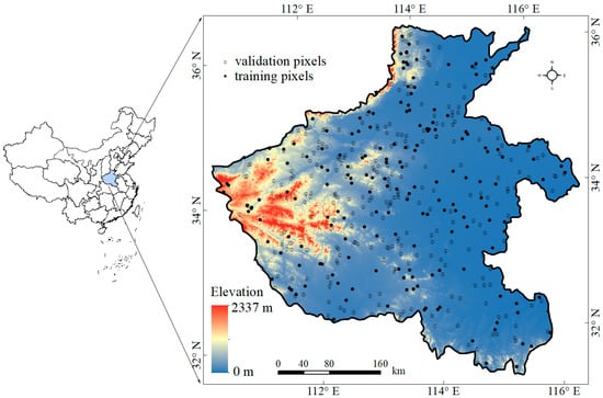 Location and topography of the study area Henan province. Also indicated are the locations of training (n = 180) and validation samples (n = 270).