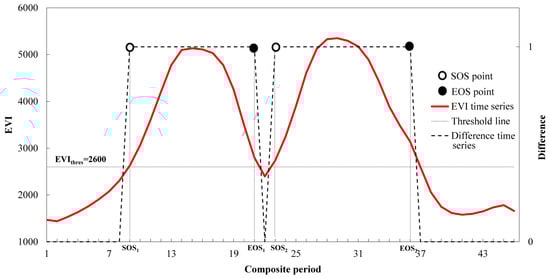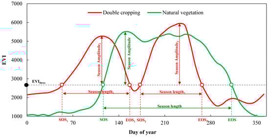 Several models have been developed to obtain season length and season amplitude from remotely sensed time-series vegetation index data, among which the ‘threshold method’ is the most widely used []. In the threshold model, the start of season (SOS) is designated as the day of year (DOY) where the vegetation index crosses the preset threshold (EVIthres) in the upward phase while the end of season (EOS) is designated as the DOY where vegetation crosses the same threshold in the downward phase [,]. This is illustrated in Figure 4, where the typical EVI profile (red line) of double cropping and natural vegetation (green line) intersect with the predefined threshold value (broken line), which we denote as SOS and EOS, respectively. The season amplitude is defined as the difference between the maximum EVI value within a growing season (i.e., between SOS and EOS) and the threshold. Season length is defined as the time span (in days) between the SOS and EOS. Therefore, in the threshold model, once the EVIthres is set, the four phenological metrics (SOS, EOS, season length and season amplitude) of a vegetation growing season are determined. It is also obvious that the season length of natural vegetation is much longer than that of crops, which could be used to distinguish them.