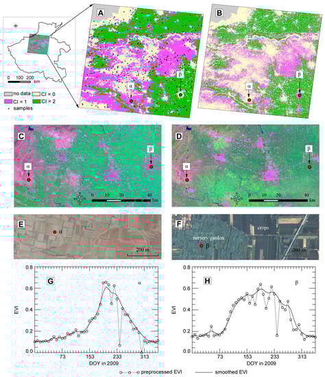 The 8-day composited MODIS09A1 (V005) product provided by the International Scientific Data Service Platform, Computer Network Information Center, Chinese Academy of Sciences (http://datamirror.csdb.cn) covering Henan Province during 2008–2010 was used in this study. The spatial resolution of this data is 500 m. EVI was chosen to map cropping patterns because it has a greater dynamic range compared to NDVI and can capture crop phenological dynamics without reaching saturation []. The period between 2008 and 2010 was selected, as for this time period good training and validation data were available.
