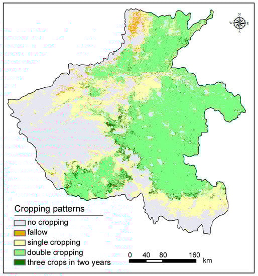 In the determination of cropping patterns, it is necessary to capture the inherent variability as well as the possible land-use/land-cover changes. A cropping pattern may span more than one year, such as the pattern of three crops in two years practiced in some regions of China (Figure 1c). Furthermore, considering the possibility of non-cropland conversion to cropland and vice versa, as well as the potential of cropping intensification and fallow, it is difficult to determine cropping patterns only considering the cropping frequency in one year.
