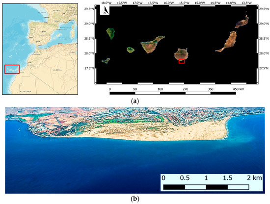 Maspalomas area: (a) Geographic location; (b) Panoramic view of the study area (scale is approximate).