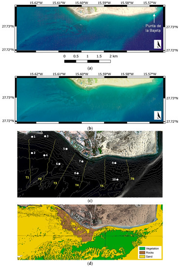 The data used in this study correspond to different years (2013 to 2017). However, the seabed of Maspalomas is in a fairly stable area with the exception of Punta de la Bajeta (marked in Figure 2a), which is the zone with the greatest topographic and sedimentary variability due to storms from the southwest.