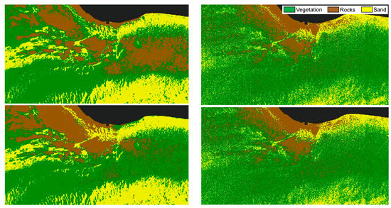 The seafloor images recorded during the field campaign (see Figure 3 for examples) show the complexity to discriminate habitat classes because they are usually mixed. Especially, submerged green aquatic vegetation meadows grow on sandy bottoms, and they have low density and mainly live between 5 and 25 m depth. In addition, rocks are partially covered by algae making automated classifications more challenging.